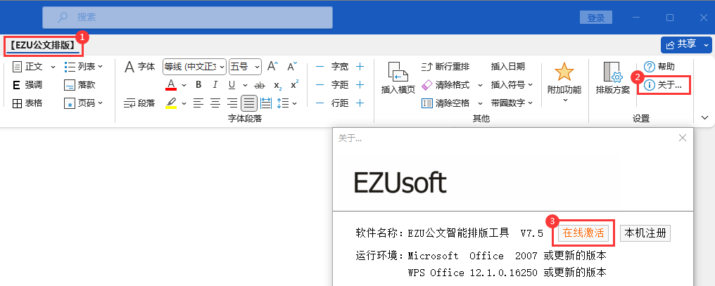 1.点击【EZU公文排版】选项卡,点击【关于…】图标,点击【在线激活】按钮;