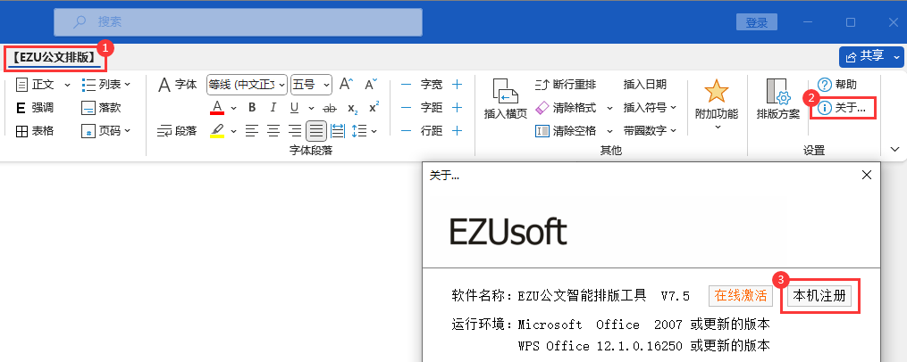 1.点击【EZU公文排版】选项卡,点击【关于…】图标,点击【本机注册】按钮;